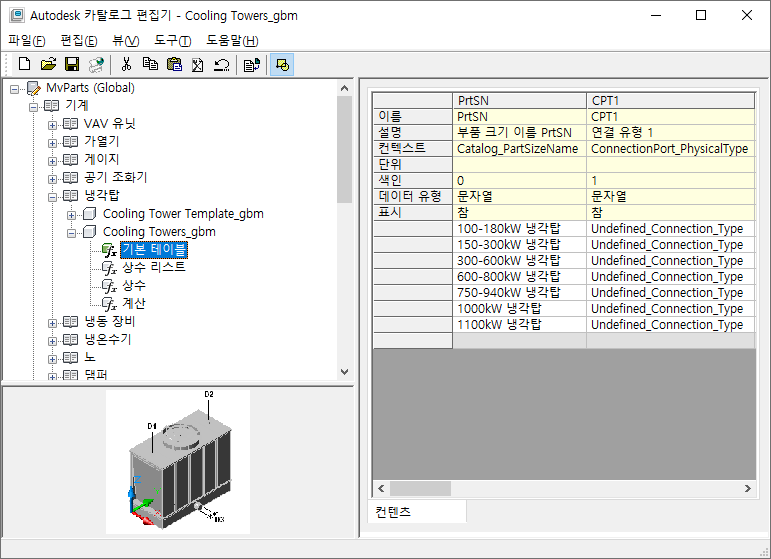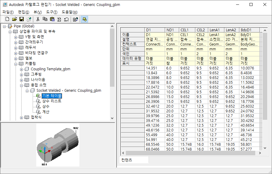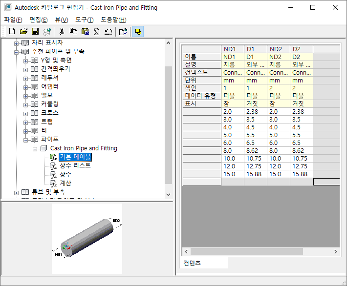 다음 예에서는 기계 장에 속하는 파이프 다중 뷰 부품 카탈로그를 보여 줍니다.