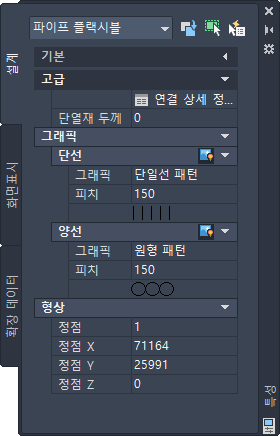 이 절에서는 특성 팔레트의 설계 탭에서 파이프 시스템을 수정하는 데 사용할 수 있는 특성을 정의합니다. 설계 탭은 기본과 고급의 두 섹션으로 나뉩니다.