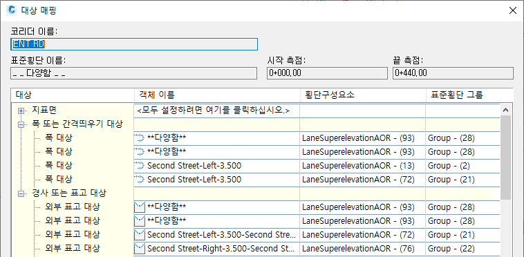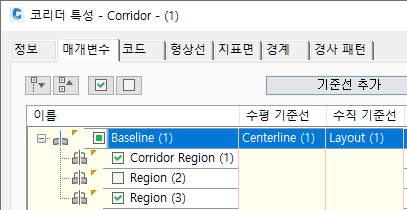코리더 특성 대화상자를 사용하면 선형과 종단뿐 아니라 측량 수치와 폴리선을 대상으로 지정할 수 있습니다. 코리더 특성에 접근하려면 코리더를 선택하여 마우스 오른쪽 버튼으로 클릭하고 코리더 특성을 선택합니다. 그림 32에 코리더 특성 대화상자가 나와 있습니다.