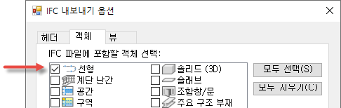 객체 탭을 클릭하고 IFC 파일에 포함할 객체를 선택합니다.