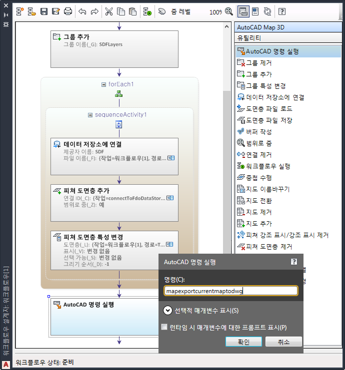 워크플로우 정의를 완성하려면 도면층을 그룹에 추가하고 AutoCAD 명령을 자동화합니다. 그런 다음 워크플로우를 저장하고 테스트합니다.