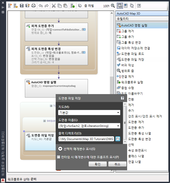 워크플로우를 실행하면 DWG 파일의 위치와 파일 이름을 묻는 메시지가 표시됩니다. 필요에 따라 이러한 매개변수를 워크플로우의 일부로 지정할 수 있습니다.