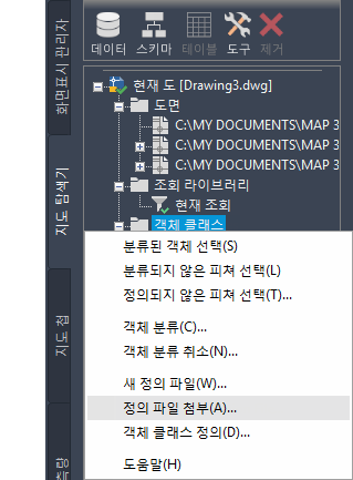 - 작업 창의 지도 탐색기 탭에서 객체 클래스를 마우스 오른쪽 버튼으로 클릭하고 정의 파일 부착을 클릭하여 객체 정의 파일을 부착합니다.