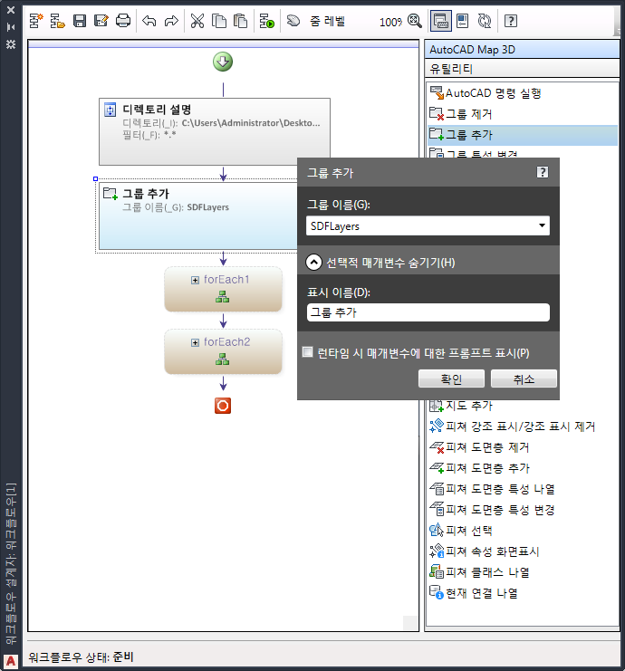 추가된 각 도면층의 그룹 특성을 변경할 것이므로 이 작업을 “LoopAddLayers”라는 ForEach 작업 안에 배치합니다.