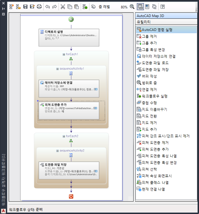 이번 연습에서는 ForEach 작업을 설명하기 위해 “LoopAddLayers”로 이름을 바꾸었습니다. 이 작업은 디렉토리 내용 표시 작업에 지정된 폴더에 있는 각 SDF 파일을 검사합니다. 반복이 수행될 때마다 각 SDF 파일에 연결하여 피쳐 도면층을 화면표시 관리자에 추가합니다.