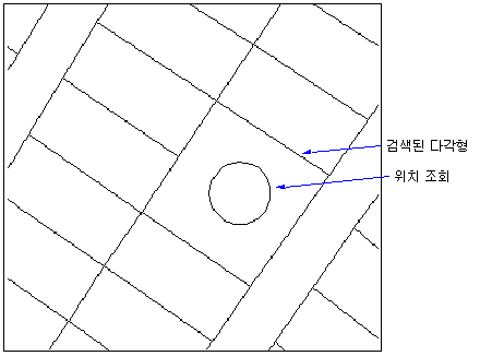 폴리곤은 경계만이 아니라 실제 영역으로도 취급됩니다. 다음 예의 경우, 폴리곤을 구성하는 객체가 조회 경계 부분에 전혀 걸치지 않는 경우라도 전체 폴리곤이 검색되도록 폴리곤 영역을 조회 경계에 걸칩니다.