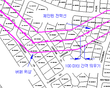 버퍼 분석을 사용하여 기존 위상 주위의 영역을 표시합니다. 이 경우, 전선 네트워크 위상의 버퍼 분석은 새 폴리곤 위상을 작성합니다.