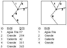 네트워크 위상을 분해하면 AutoCAD Map 3D 도구 세트에서 두 선이 지정된 노드에서 교차하는지와 분해 필드가 같은지 확인하기 위해 선 사이의 노드를 점검합니다. 그렇다면, 해당 노드는 제거되고 두 링크는 하나의 링크로 결합됩니다. 분해 필드 및 새 위상 필드를 제외한 전체 객체 필드가 다음 그림과 같이 제거됩니다.