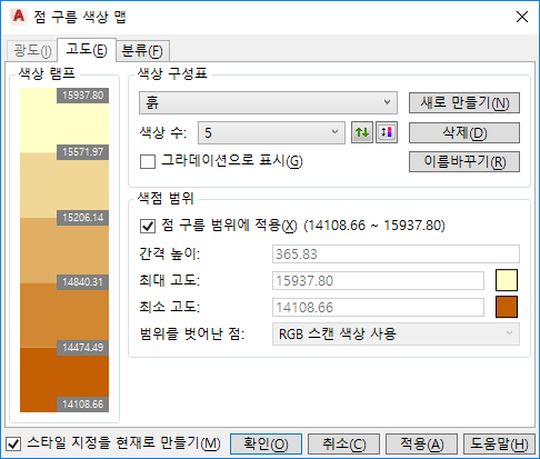 - 점 구름 색상 맵 대화상자에서 광도 또는 고도 탭을 클릭합니다.