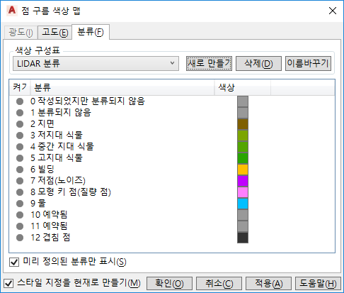 - 화면표시 관리자에서 스타일을 지정하려는 점 구름 도면층을 마우스 오른쪽 버튼으로 클릭한 다음 스타일 설정을 선택합니다. 점 구름 색상 맵 대화상자에서 광도, 고도 및 분류 탭으로 이동하여 드롭다운에서 색상 구성표를 선택합니다.