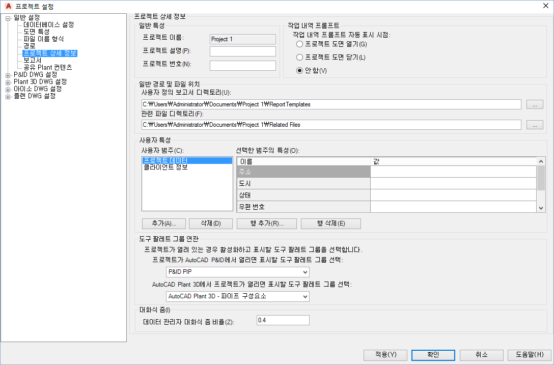 프로젝트 및 제도 기본 설정(예: 구성요소 기호, 태깅 규칙, 주석 특성, 도면층 및 색상)을 구성합니다.