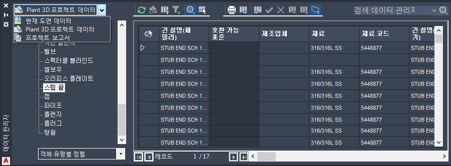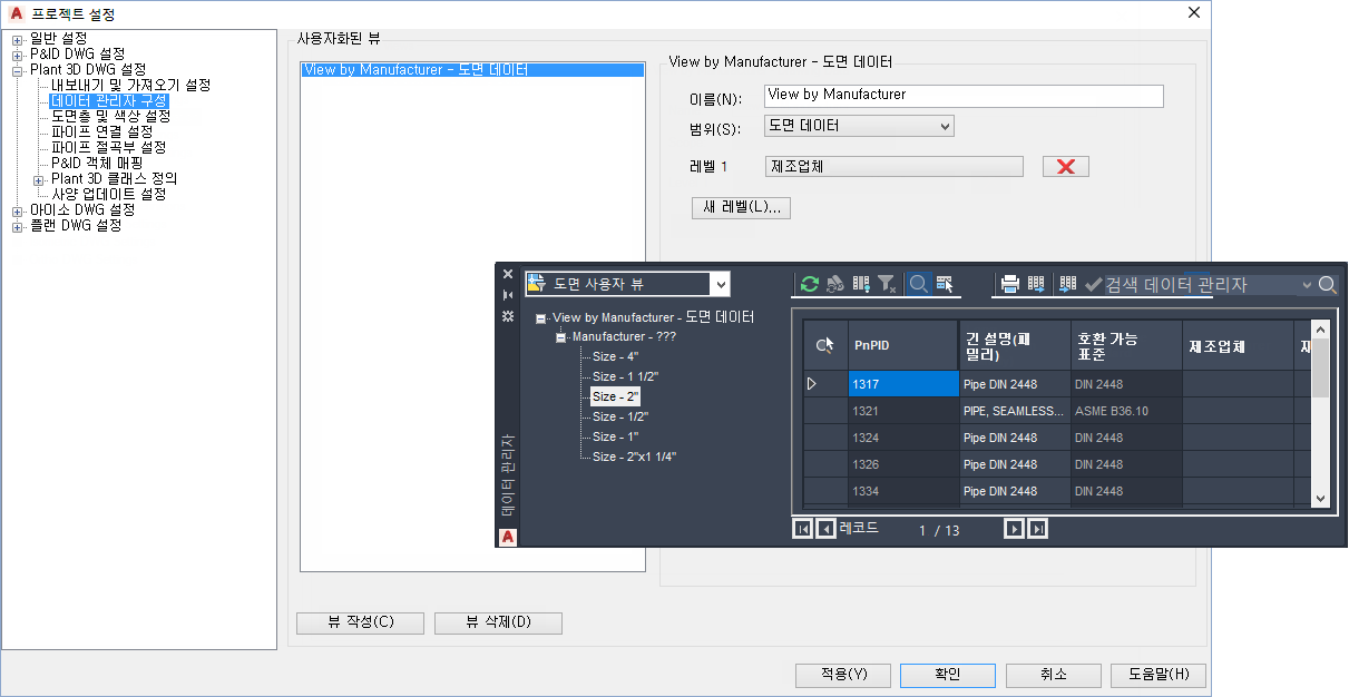 데이터 관리자에서는 프로젝트, 도면, 내장 보고서 등 다양한 방법으로 데이터를 볼 수 있습니다.