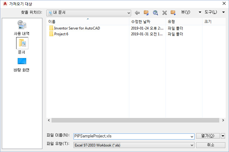 프로젝트를 가져올지, 도면 데이터를 가져올지 또는 프로젝트 보고서를 가져올지에 따라 데이터 가져오기 대화상자 또는 시트 선택 대화상자가 열립니다.
