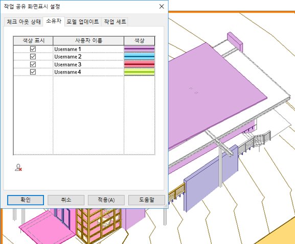 작업 공유 화면표시 설정을 클릭합니다. 해당하는 소유자의 지정된 색상이 모델에 표시됩니다.