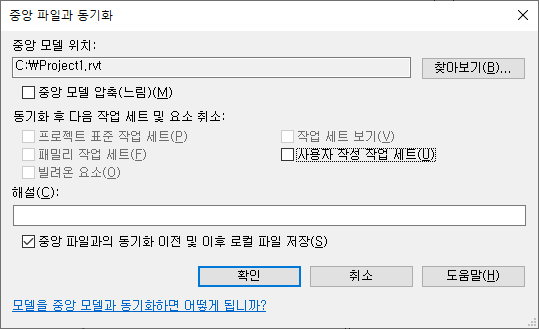 | 결과: 로컬 파일이 중앙 파일과 동기화됩니다. | 해당 없음: 저장 후 중앙 모델로 만들기 옵션은 항상 선택되어 있습니다. |