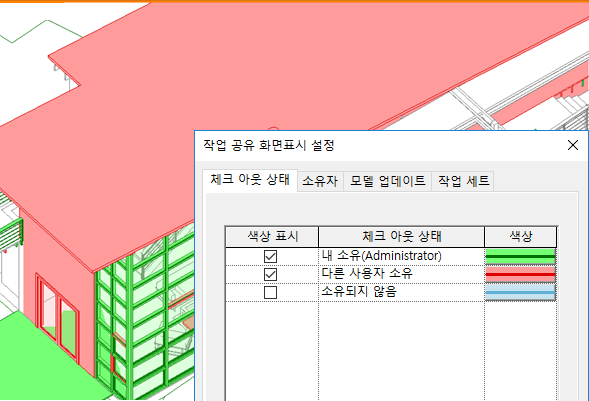 해당 소유자 체크 아웃 상태에 지정된 색상이 모델에 표시됩니다.