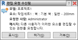 작업 공유 프로젝트를 사용하여 작업하는 경우 의사소통을 원활히 하기 위해 팀 구성원은 요소 차용 요청이 요청, 허가 및 거부될 때 자동 알림 메시지를 수신합니다.