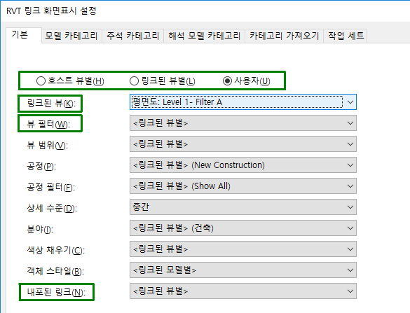 호스트 뷰에서 링크된 모델의 필터 사용을 제어하려면 RVT 링크 화면표시 설정 대화상자의 설정을 사용합니다.