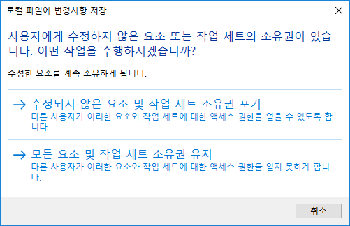 이 옵션을 사용하면 변경사항이 중앙 모델과 동기화되지 않고 로컬 모델에 저장되며 로컬 파일에 변경사항 저장 대화상자가 표시됩니다. 중앙 파일과 동기화하지 않았으므로 수정된 요소를 계속 소유하게 됩니다.