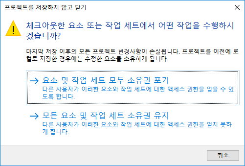 작업 공유 프로젝트의 변경 내용을 저장하지 않고 로컬 모델을 닫는 경우 변경사항이 저장되지 않음 대화상자가 표시됩니다.