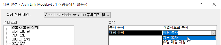 링크된 모델에서 MEP 모델로 설비를 복사할 때 또는 그 이전에 좌표 설정 지정 대화상자에서 각 설비 카테고리에 대해 매핑 동작을 지정합니다.