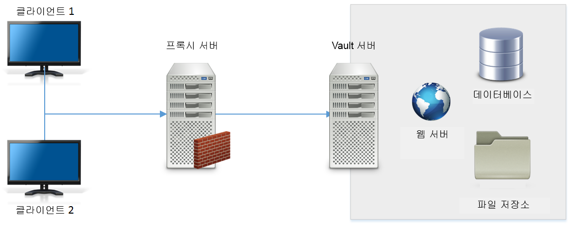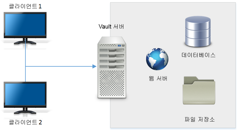 Vault 서버는 웹 서버, 데이터베이스 및 파일 저장소의 세 가지 기본 구성요소로 이루어져 있습니다. 다음 그림은 구성요소의 기본 구성을 보여줍니다.