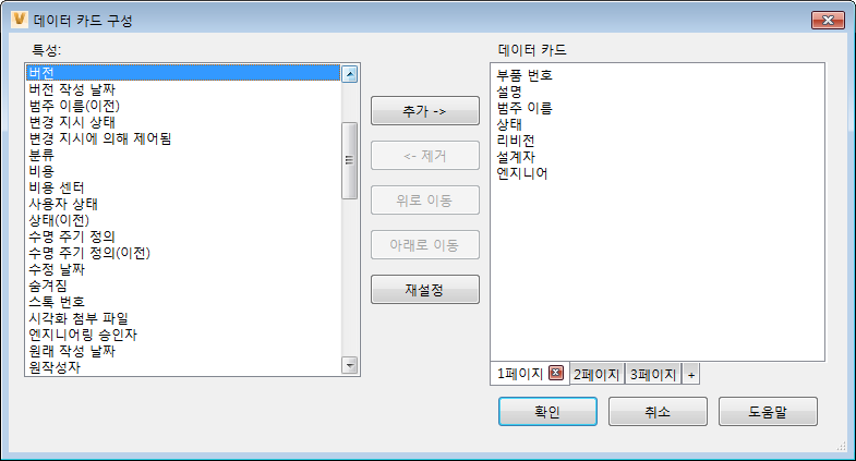 - 관리자는 데이터 카드에 사용되는 페이지 수와 사용자화된 관리 환경에 대해 표시되는 특성을 결정하여 데이터 카드 배치를 구성할 수 있습니다. Autodesk Vault Client의 Vault 설정 대화상자의 동작 탭에서 데이터 카드 구성 대화상자에 액세스할 수 있습니다.