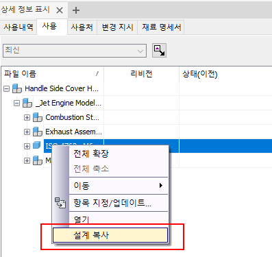 Inventor의 상세 정보 표시 창에서 설계 복사 대화상자를 열 수 있습니다.
