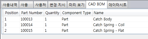 CAD-BOM 미리보기 창에는 외부 응용프로그램에서 수집된 데이터를 비롯하여 선택한 파일에 대한 BOM 상세 정보가 표시됩니다.