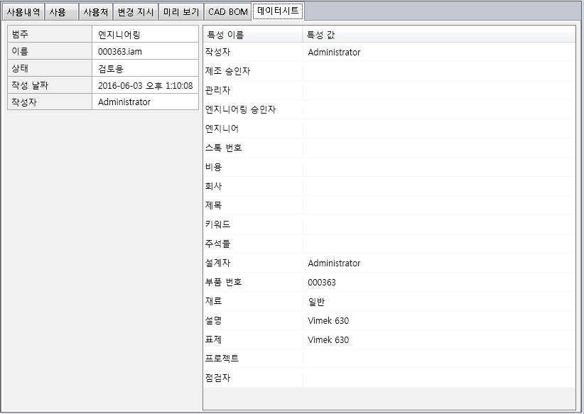 Data Standard가 설치되어 있으면 Vault 클라이언트 및 Vault Office 클라이언트에 기본적으로 두 개의 새 탭(CAD-BOM 및 데이터 시트)이 표시됩니다.