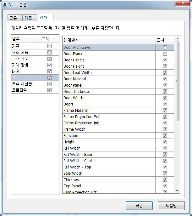 Vault 옵션 대화상자의 검색 탭에서 설정을 구성하여 패밀리 로드 대화상자의 왼쪽 창에서 검색에 표시되는 범주 및 매개변수를 제어할 수 있습니다.