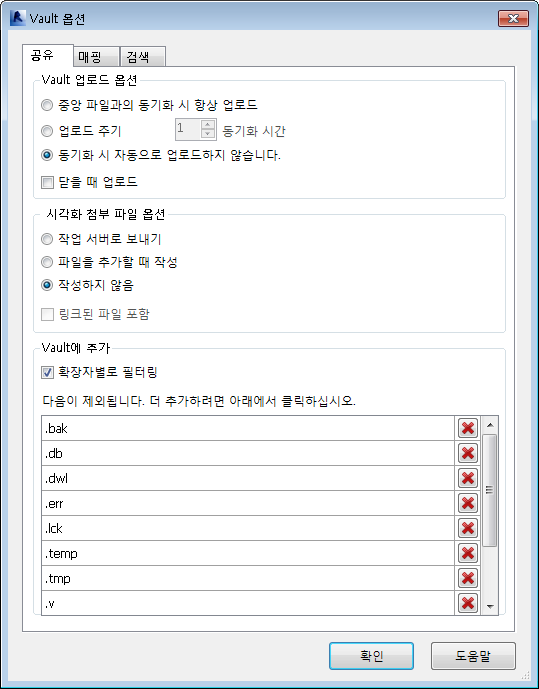Vault 업로드 옵션을 사용하여, 동기화된 파일이 Vault에 추가되는 시점을 구성할 수 있습니다.