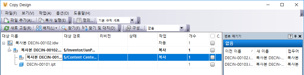 예를 들어 파일이 복사되도록 표시되어 있고 연관된 도면이 자동으로 표시된 경우, 복사 작업이 완료되면 도면에 동일한 새 파일 이름이 적용되고 도면이 위치를 연관된 파일로 저장합니다.
