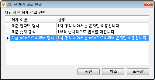 - 리비전 체계 정의 변경 대화상자에서 선택한 항목에 지정하려는 새 리비전 체계를 선택합니다. 확인을 클릭합니다.