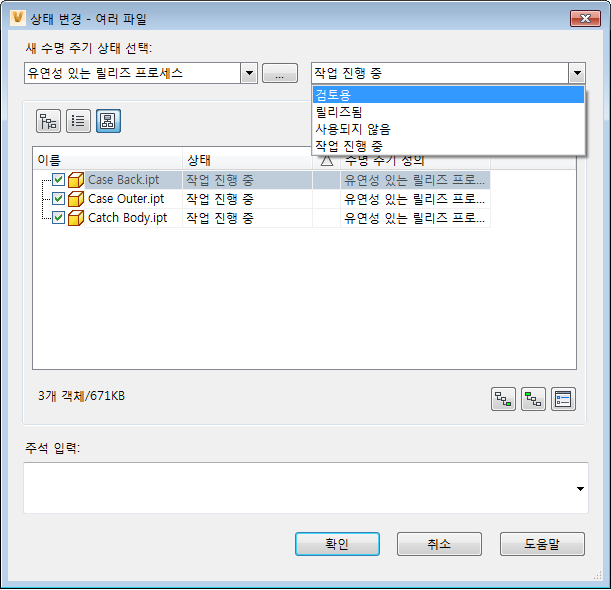 "..." 버튼을 클릭하여 새 수명 주기 정의를 선택하여 파일 그리드에서 모든 프로젝트 데이터의 수명 주기 정의를 변경할 수 있습니다. 수명 주기 정의 변경 선택 대화상자에 나열된 수명 주기 정의는 파일 그리드의 모든 파일에 적용되는 수명 주기뿐입니다. 즉, 대화상자에는 객체 그리드의 각 파일에 사용할 수 있는 수명 주기 정의 교차점이 나열됩니다. 해당 수명 주기가 객체로 동일한 범주에 지정된 경우 수명 주기 정의는 사용 가능한 것으로 간주됩니다.