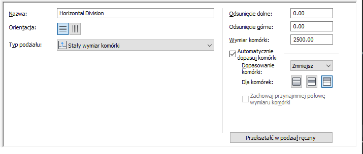 W przypadku konfigurowania podziału w pionie wymiarem komórki jest jej długość liczona między kolejnymi szprosami. Przy podziale poziomym wymiarem komórki jest jej wysokość.