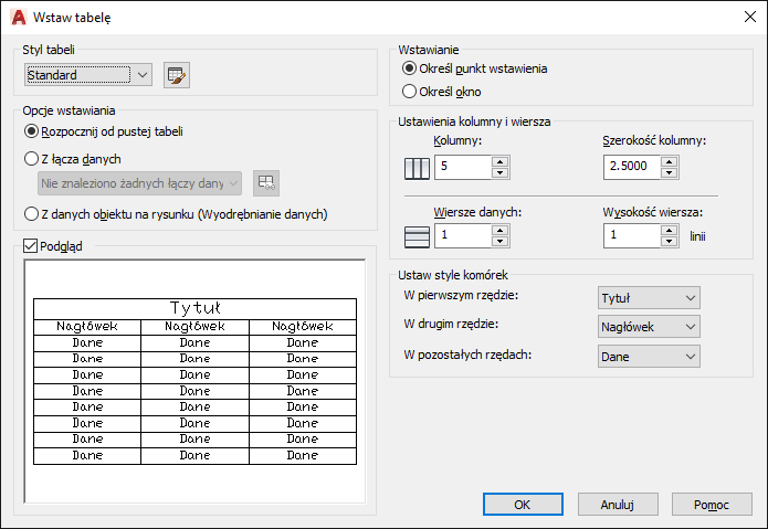 Z bieżącego rysunku należy wybrać styl tabeli, który posłuży do utworzenia tabeli. Nowy styl tabeli można utworzyć, klikając przycisk obok listy rozwijanej.
