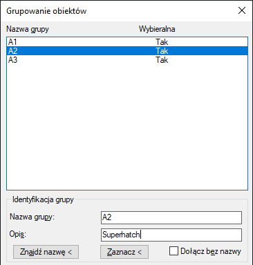 3) Wybierz grupę. Zwróć uwagę, że w polu opisu grup utworzonych poleceniem SUPERHATCH wyświetlany jest napis „superhatch” (superkreskowanie).