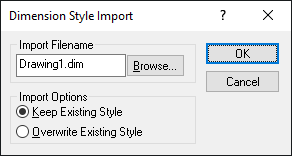 | Import Options | Obejmują opcję Keep the Existing Style zachowującą styl wymiarowania w bieżącym rysunku i opcję Overwrite Existing Style nadpisującą style w bieżącym rysunku. Opcja Keep the Existing Style ignoruje podobnie nazwany importowany styl; opcja Overwrite Existing Style używa podobnie nazwanego importowanego stylu. |