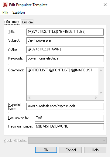 | Active template | Określ plik szablonu, który ma zostać użyty w celu aktualizacji pól Właściwości rysunku. |