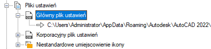 Za pomocą edytora Dostosuj interfejs użytkownika (CUIx) można tworzyć, resetować i przywracać pliki ustawień oraz zmieniać ich nazwy. Określ główne pliki ustawień lub korporacyjne pliki adaptacji.