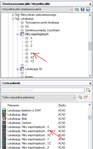 • Na panelu Dostosowywane pliki: <nazwa pliku> znajdź i wybierz polecenie w elemencie interfejsu użytkownika.