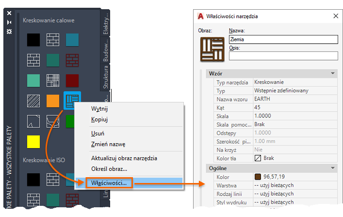 Po dodaniu narzędzia do palety narzędzi można zmienić jego domyślne właściwości. Przykładowo można zmienić skalę wstawienia bloku lub warstwę wzoru kreskowania.