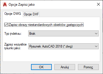 Nie tworzy indeksów warstw ani przestrzennych podczas zapisywania rysunku.