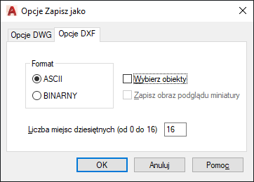 Określa, czy zostanie utworzony plik ASCII czy binarny DXF. Pliki DXF w formacie ASCII mogą być wczytane do edytora tekstowego i są kompatybilne z szerszym zakresem aplikacji. Pliki DXF w formacie binarnym mają mniejszy rozmiar. Odczyt i zapis plików w formacie binarnym jest szybszy niż w przypadku plików w formacie ASCII.