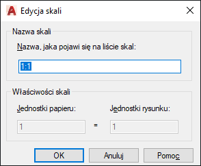 Podaj nazwę opisową lub liczbową. Na przykład w rysunku architekturalnym z typową skalą calową można podać 1”=4’ lub 1:48.