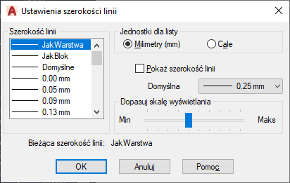 Ustawia bieżącą szerokość linii i jednostki szerokości linii, steruje wyświetlaniem i skalą wyświetlania szerokości linii oraz ustawia wartość szerokości linii DOMYŚLNA dla warstw.