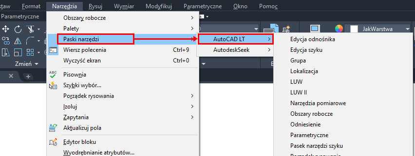 Uwaga: Upewnij się, że masz otwarty rysunek, aby było uwzględnione menu Narzędzia.