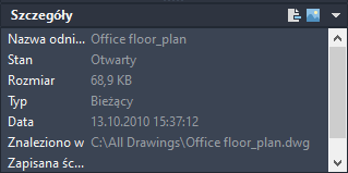 Podczas korzystania z trybu Szczegóły podawane są właściwości zaznaczonego odniesienia pliku. Każde odniesienie pliku ma podstawowy zestaw właściwości, a dla niektórych odniesień pliku, jak np. obrazy z odnośnika, są wyświetlane właściwości specyficzne dla danego typu pliku. Podstawowy zestaw właściwości zawiera takie informacje jak: nazwa odnośnika, stan, rozmiar pliku, typ pliku, data utworzenia, zapisana ścieżka, ścieżka odnalezionego pliku oraz wersja pliku, jeśli jest zainstalowany klient programu Autodesk Vault (niedostępny w programie AutoCAD LT). Niektóre właściwości można edytować.