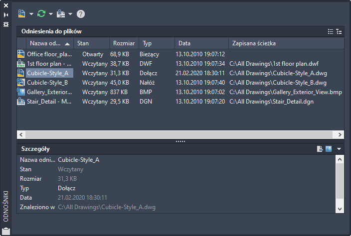 Wyświetla listę odniesień w bieżącym rysunku, w tym takie informacje jak stan, rozmiar i data utworzenia pliku.